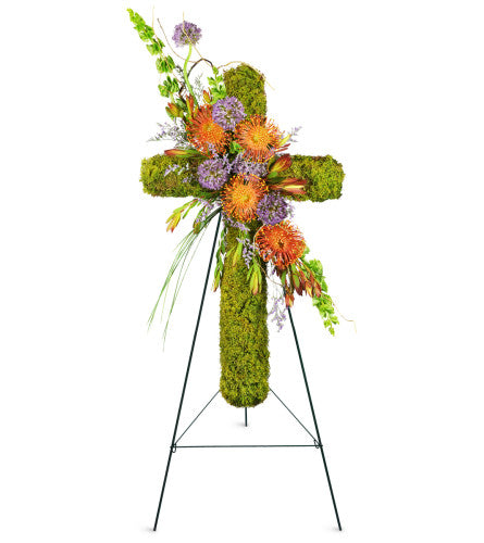 Like the promise of returning Spring, this symbol of eternal faith comforts in a time of sorrow. Express your admiration for a unique life lived with this one-of-a-kind standing cross spray, featuring lovely green moss, pincushion protea and bells of Ireland. When "typical" just won’t do, this striking sympathy arrangement adds an exotic touch to the chapel and visitation parlor alike.