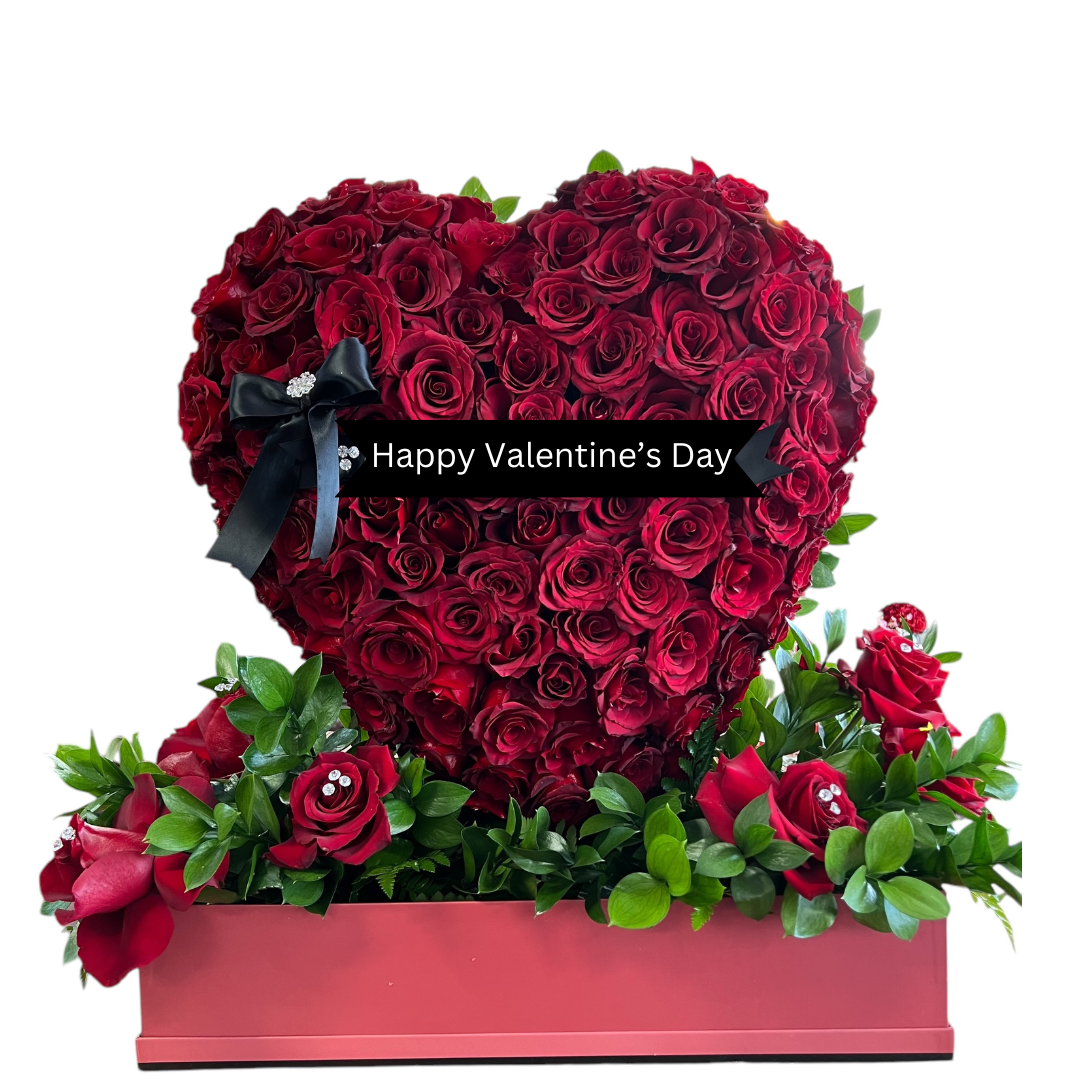 Make Valentines Day unforgettable with this heart-shaped bouquet of vibrant red roses, wrapped in elegant pink and accented with a delicate ribbon and sparkling embellishment. Complete with a Happy Valentines Day banner, this arrangement is a perfect symbol of love and devotion.